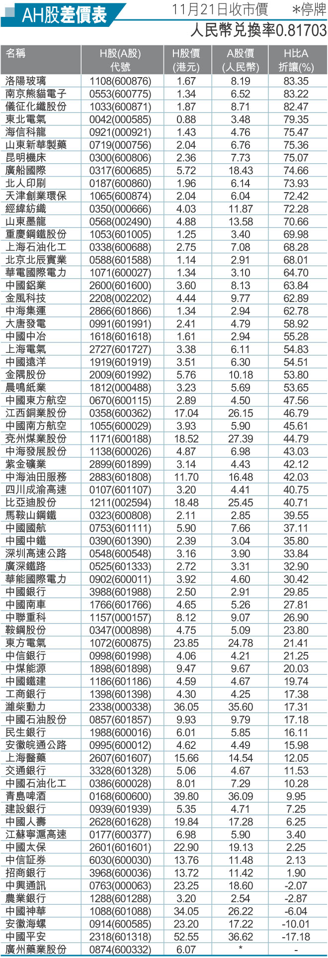 AH股差價表(11月21日收市價) (2011-11-22) (圖)