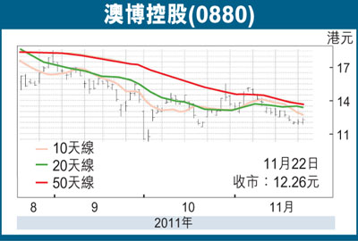現時澳博旗下的娛樂場有旗艦新葡京、十六浦、海立方、葡京酒店、集美、澳門蘭桂坊及凱旋門等,為澳門最大的娛樂場經營商,也因為網點分佈廣,因此其競爭優勢在短期被逾越的難度仍大。基於此股於2011年的預測市盈率約12倍,估值較同業有偏低的優勢,配合集團積極減少成本,以及全力搶佔市場,加上其派息率有提升的空間,都有利吸引基金買盤垂青。趁股價初現反彈跟進,博反彈目標仍睇本月初阻力位的15元水平。