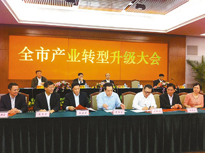 ■深圳市政府與各區簽訂產業轉型升級工作責任書。 香港文匯報記者郭若溪 攝