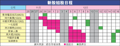 香港文匯報訊(記者 廖毅然)下周起新股市場將迎來今年最後一個高潮,重磅股將盡數而出。在暴風雨前夕,昨天的新股市場相對淡靜,時代集團孖展認購少,但廣豪(0844)首天掛牌意外升18.75%。