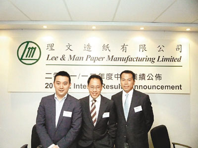 ■理文造紙執行董事李文斌(左)、首席執行官李文俊(中)及副總裁陳繼良。香港文匯報記者李永青 攝