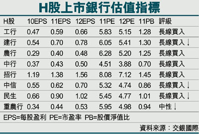銀行2012年業績增速將下降,不良餘額也將溫和反彈。雖然銀行盈利增長和盈利能力橫向比較依然相對較高,資產品質也依然較好,估值仍處歷史低位,但鑒於投資者在2季度經濟見底和政策明顯放鬆之前更注重負面因素,及銀行股前期漲幅較大,下調行業評級至同步。個股上,下調建行(0939)、中信(0998)、民生(1988)評級至長線買入,下調Beta(啤打系數)較高的重慶農商行(3618)評級至中性。由於對明年2季度之前銀行股表現持謹慎看法,對上市銀行目標價也有所下調。偏好防禦性相對高的工行(1398)、建行。