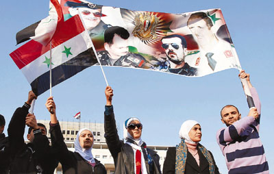 ■支持者舉起總統巴沙爾橫額示威。 法新社