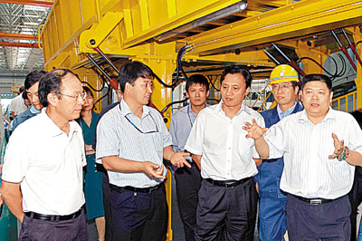 ■中國北車股份有限公司董事長崔殿國(右二)、總裁奚國華(左一)、唐車公司董事長余衛平(右一)在唐車公司檢查指導工作。