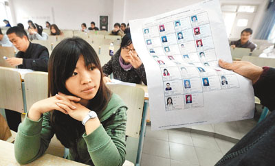 ■在安徽合肥一考點,監考老師在核對考生信息。新華社