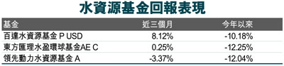 據基金經理表示,水資源作為一個有獨特的投資理念,在上月全球股市反彈浪中,儘管基金的平均6.64%漲幅,處於其間行業基金排行榜的中下游位置,然而這板塊股具低貝他值(個股的股價變動與市場大盤指數變動的相關性),加上擁有較吸引的股息,因此8月、9月環球股市爆發股災,水資源基金的平均6.56%和3.55%跌幅,雙雙處於其間行業基金排行榜的中上游位置。