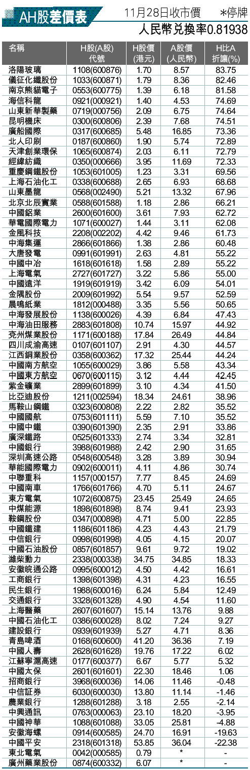 AH股差價表 (2011-11-29) (圖)
