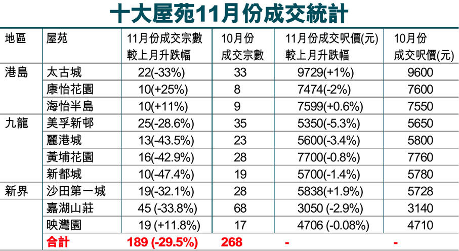 十大屋苑11月份成交統計