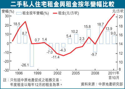 中原地產研究部聯席董事黃良昇指出,據該行新簽租約統計,今年10月份全港85個大型私人住宅屋苑的平均租金每平方呎錄得20.5元,與去年底的18.8元相比,今年首10個月上升9%,10月份的呎租按月輕微下跌0.5%,為近30個月以來首度回落。