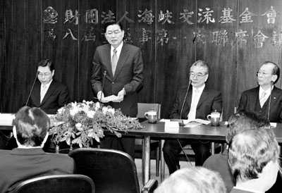 ■財團法人海峽交流基金會2日在台北舉行第8屆董監事第1次聯席會議,會中推舉新任董事長,由現任董事長江丙坤(後排左2)續任。 中央社