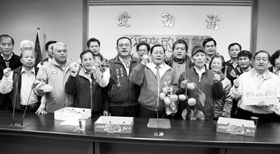 ■苗栗縣長劉政鴻(紅衣者)與各鄉鎮農會、柿農2日對民進黨主席蔡英文道歉表示「沒誠意,不接受」。 中央社