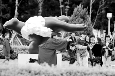 藝術家李真雕塑展,吸引許多民眾拍照欣賞, 1名學生穿著畢業服在巨型作品前取景,反倒吸引更多目光。 中央社