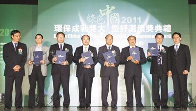 得獎者左起為:溫江區宣傳部部長方正行、益陽市副市長楊躍濤、舞剛市委書記高永華、珠海市常務副市長霍榮蔭、大理州政府新聞辦公室主任李江,潢元市委常委副市長黃正富,由中聯辦教科部副部長李魯(左一)、香港文匯報董事總經理歐陽曉晴頒獎(右一)。