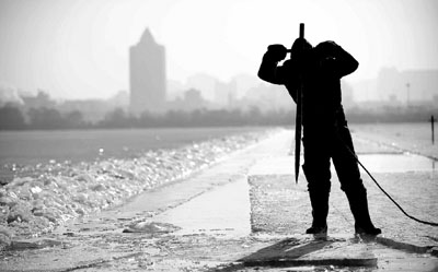 ■黑龍江哈爾濱市民正在松花江上採冰準備做冰雕。 新華社
