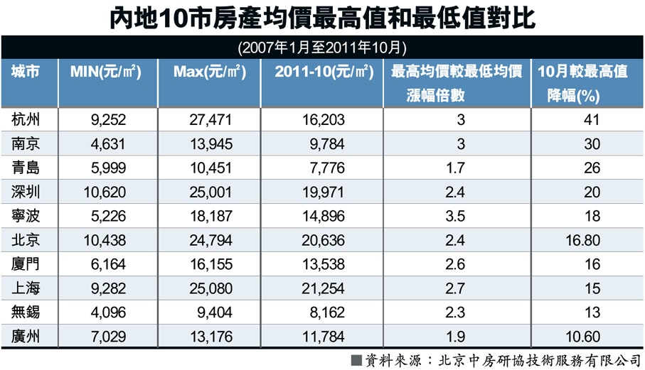 內地10市房產均價最高值和最低值對比 (2011-12-10) (圖)