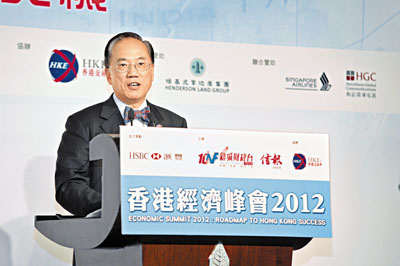 曾蔭權昨日出席「香港經濟峰會2012」午餐會並發表演說。就近日市場流傳當局會放寬額外印花稅等穩定樓價措施,曾蔭權主動回應道:「我想重申,特區政府會繼續打擊短期炒賣,而且推行我們其他一籃子措施,維持樓巿的健康、穩定。政府會有需要時候檢討這些措施,但現時完全沒有啟動這個機制。同時,我們會繼續以各種途徑去增加土地供應。」