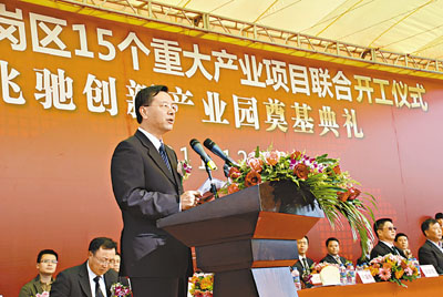 ■深圳市龍崗區區長姜建軍在重大項目開工儀式上講話。 香港文匯報記者羅珍 攝