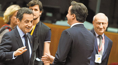 英國在歐盟峰會上與德法針鋒相對,法國總統薩科齊不但公開指斥英國不是,私下更展現真性情,當英國首相卡梅倫趨前欲握手言和時,薩科齊避開視線拒絕握手,熱情地向身旁其他人揮手,一臉尷尬的卡梅倫只好苦笑,輕拍薩科齊的肩膀化解尷尬氣氛。 ■《每日郵報》