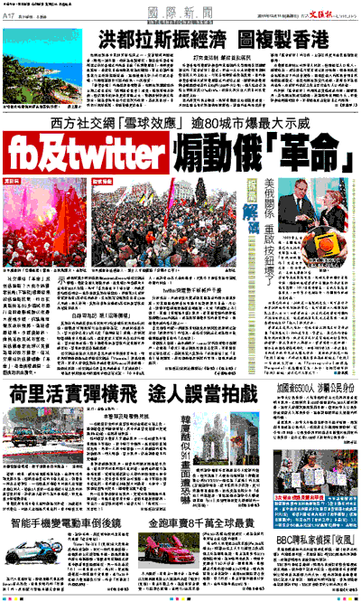 社交網站「革命」殺到俄羅斯?大批不滿國家杜馬(下議院)選舉結果的俄羅斯民眾,昨日在莫斯科等80多個城市舉行自前蘇聯解體以來最大規模示威,抗議總理普京政府舞弊、偽造選舉結果。示威獲紐約、倫敦等歐美城市響應,有俄國專家批評以美國為首的西方國家,借社交網站於俄國煽動「革命」,蓄意挑撥離間,企圖挑起流血衝突。