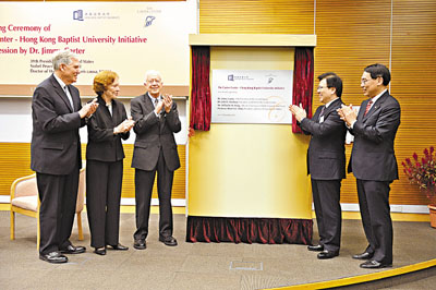 ■(左起)卡特中心總裁兼執行總監何迎翰、卡特夫人、占美.卡特、王英偉及浸大校長陳新滋為卡特中心—香港浸會大學項目辦公室主持揭幕。 浸大提供