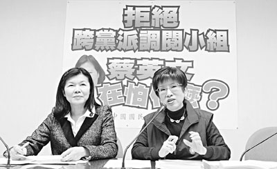 ■「立法院」國民黨團副書記長潘維剛(左)、立委洪秀柱(右)14日舉行記者會,呼籲民進黨團一起成立調閱小組,讓民眾知道「國發基金」投資宇昌案的真相。