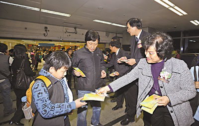 ■石丹理教授(右二)和許林燕明(右一)在羅湖邊境管制站離境大堂派發禁毒宣傳物品。