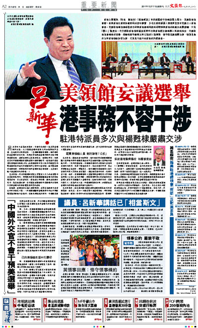呂新華表示,注意到前幾天楊甦棣與香港傳媒茶敘時的有關表態。他指出,美方一方面否認干預香港事務,同時對區議會選舉「種票」事件和行政長官選舉等發表評論。維基解密網站披露的美駐港總領館電文也表明美方有關其未干預香港事務的辯解是站不住腳的。希望美方真正引起警覺並付諸行動,不要再干預香港內部事務。