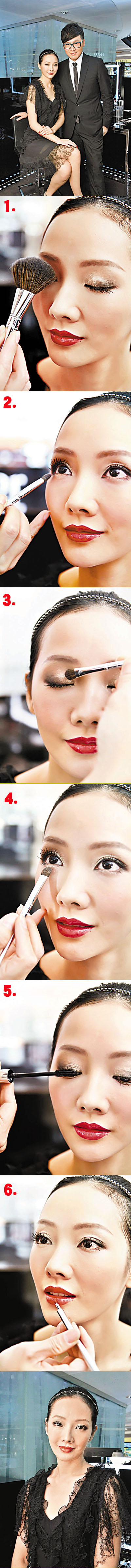 1.以大眼妝掃在迪奧幻彩五色眼影(#554)碟上混色並壓在眼皮上,日妝只需來回輕掃,晚妝則混以較多深色眼影,從外眼蓋向內掃至眼皮中央位置。