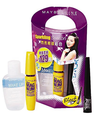 內有瞬盈睫毛液–極緻濃密版、EYE STUDIO閃鑽眼線液(黑色)及眼唇二合一卸妝液(40ml),瞬盈睫毛液擁有獨特超大掃頭和極細密掃毛,輕輕一掃,隨即由根部至尾部貫串每根睫毛,即時塑造9倍極緻濃密之睫毛。眼線液帶有閃粉,能令雙目更加閃亮。加上持久濃厚色澤及防水配方,令攝人眼眸更添完美,全日長效閃爍。而眼唇二合一卸妝液,則只需簡單一步即可卸除眼部及唇部的化妝。