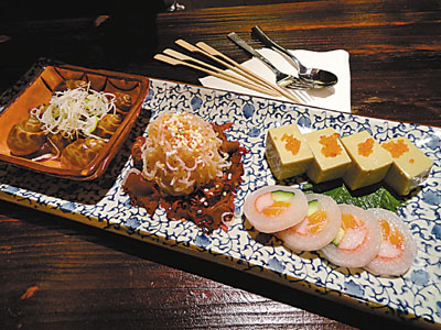 前菜雪裡紅三色酢物、東風螺、明太子芋絲、蟹味豆腐