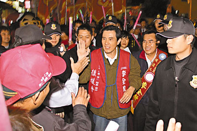 ■馬英九17日晚間在台南市永康區掃街,沿路與支持者一一擊掌、握手。中央社