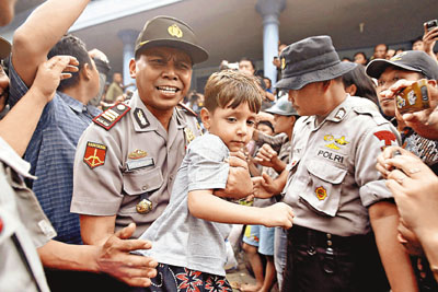 ■一名小童怒海中僥倖生還,猶有驚恐之色,由警員帶至移民署。 法新社