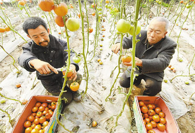 19日,在寧夏回族自治區賀蘭縣新平國家級農業示範園區,兩位農民在溫棚內採摘番茄。 近年,賀蘭縣大力推進失地農民就業致富工作,經4年建設,佔地6600畝的新平國家級農業示範園區已經建成二代日光溫棚2600座。這些溫棚全部轉讓給失地農民種植,每座溫棚平均年收入在2.5萬元以上,共解決3500餘人的生活、就業問題。 ■新華社