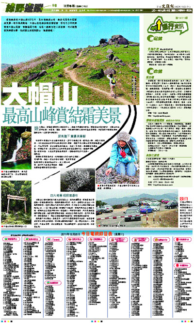 香港最高峰大帽山高957公尺,是全港最高山峰,最出名是冬天結霜的美景。每年寒流襲港,大帽山在低溫出現植物結霜,吸引不少市民開車到大帽山賞霜,車輛絡繹不絕,站在一處風光迷人的松崗,可以飽覽新界南部全景,包括聳立的新界群山,氣勢磅礡!