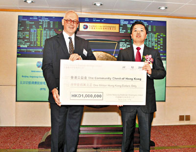 ■中國織材昨日上市,主席兼執行董事鄭洪(右)捐贈善款予公益金名譽副會長施德論GBS太平紳士。