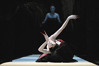 白鳥死後,〈渡鏡〉一幕是Yaki與Samo因慾而相鬥,發出如野獸般的嘶吼。二人的上身以盤骨為圓心轉動,在空間轉動畫圓,揮動手上的長矛,而他們冠上的平劇翎子因二人上身的盤繞,鞭打著周遭的空氣分子。〈渡鏡〉之前的沉緩就如漩渦,把觀眾的三魂六魄全然吸進舞台這無底的黑洞。現在Yaki與Samo的叫喊就如超新星爆炸,隨著上身的盤繞,將源源不絕的能量如漣漪般往外擴散,衝擊觀眾的心靈。抽空了的心神受到猛烈的衝擊,換來的是無力感。Yaki與Samo慾念,如同無情的烈焰燒毀了一切。