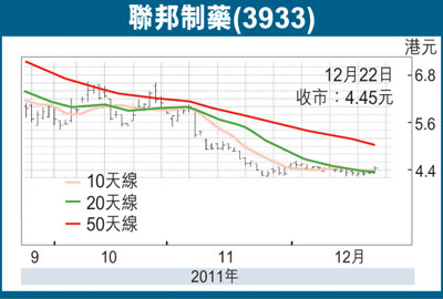 臨近聖誕節長假期,港股昨日已籠罩假日氣氛,全日波幅也告明顯收窄,不過觀乎個股表現仍見活躍,就以過去一段時間反覆尋底的聯邦制藥(3933)為例,便曾一度走高至4.49元,收市報4.45元,仍升0.13元或3%,成交1,064萬元。經過昨日續升,該股已收復10天及20天線,而收市價因較年低位的4.24元,回升幅度不足5%,在預期進一步下跌風險已降,以及資金傾向收集落後實力股下,該股後市表現仍值得留意。