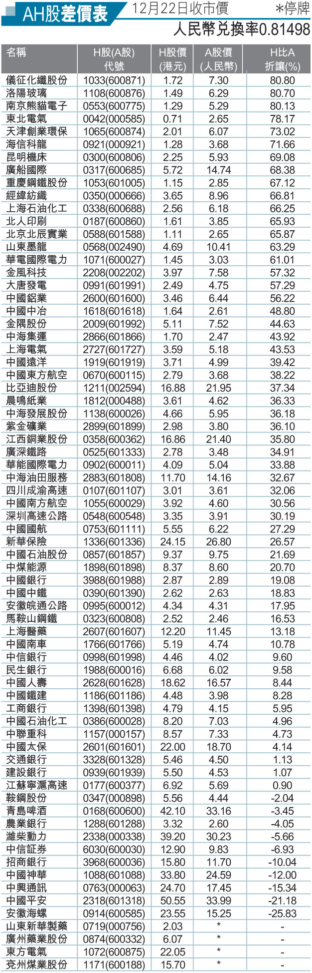 AH股差價表(12月22日收市價) (2011-12-23) (圖)
