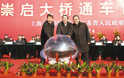 ■上海市委書記俞正聲、江蘇省委書記羅志軍、交通運輸部部長李盛霖共同主持崇啟大橋通車儀式。新華社