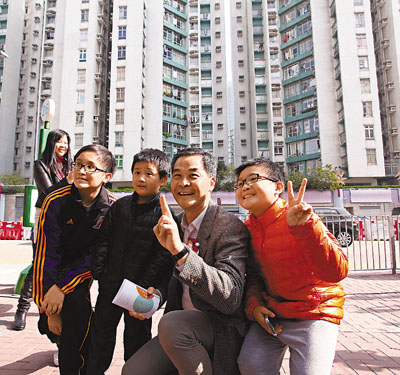 ■梁振英到紅磡派傳單,並與小朋友合照。香港文匯報記者黃偉邦 攝