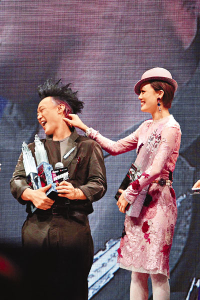 當何韻詩接受訪問時,Eason隔住祖兒爭住講洁A司儀便打算讓Eason講,蘇永康即嚷著說:「唔好,要畀半個鐘佢。」之後祖兒又多手除去Eason的黑超,原來他的右眼化了妝,為免造型曝光,Eason鬼馬地合眼扮盲俠。Eason與祖兒這對歡喜冤家,多年來在頒獎禮上都爭得你死我活,前晚當祖兒奪得《新城勁爆年度專輯》時,Eason就對身旁的祖兒說:「終於畀你得償所願啦,成日話我垣矷C」祖兒即得戚地左搖右擺,Eason亦大方恭喜她:「恭喜你啦,我無狫縑C」