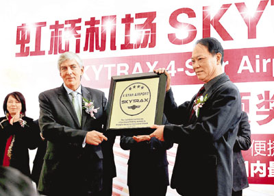 上海虹橋機場繼北京首都機場、海口美蘭機場之後,獲評為內地第三家、全球第十家Skytrax「四星機場」。圖為4日,全球航空運輸的權威認證機構Skytrax在上海向上海虹橋國際機場授予「四星機場」證書。 ■新華社