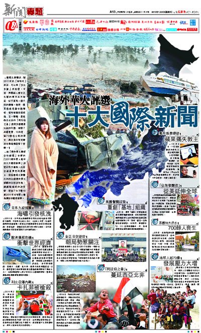 由「海外華文傳媒合作組織」主辦的「2011海外華人眼中的十大國際新聞」評選於昨日揭曉。在綜合讀者意見的基礎上,包括香港文匯報在內的32家海外華文媒體的50多位社長、總編輯組成的評委會,選出了以下這10條2011年全球華人最為關注的國際新聞。