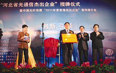 香港文匯報訊(記者 張帆 石家莊報道)河北省工業經濟聯合會日前舉辦「河北省光通信傑出企業」授牌儀式暨中國光纖(3777)榮膺「2011年度香港傑出企業」宣傳推介會。