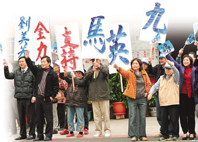 ■在新北市,藍營支持者在街頭舉起支持馬英九的標語。 法新社