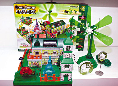 香港文匯報訊(記者 劉璇)玩具展上,Amazing Toys Ltd總經理施維衡向記者展示環保教育玩具Paradise,該款玩具自身不需要電池,完全由太陽能、風力以及手搖發電。據悉,該款玩具以環保概念一舉奪得是次玩具展的最佳環保設計獎。