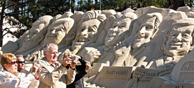 將舉行下一場初選的南卡羅來納州,動用525噸沙,在月桂堤為參選人堆成沙雕,由左至右分別為羅姆尼、金里奇和洪博培,樣貌栩栩如生。 《每日郵報》