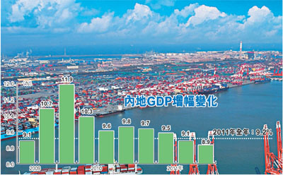 國家統計局昨日發布2011年中國宏觀經濟數據顯示,內地去年第四季實際GDP增8.9%,是2009年第二季以來最低增速,但高於市場預期的8.7%的增幅,從環比看,四季度增長2%。同時,12月工業生產和零售銷售年率分別增長12.8%和18.1%,分別高於預期12.3%和17.3%的增幅,也高於11月份12.4%和17.3%的增幅;2011年1至12月份不含農戶的固定資產投資年率增長23.8%,低於前值24.5%和預期增幅24.0%。