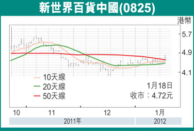 新世界百貨中國(0825)位於綿陽市開設的綿陽新世界百貨已於上月開業,使集團在內地經營管理的百貨店/商場數目增加至39家,在市場對內需概念股仍然情有所鍾下,其後市表現不妨看高一線。而在昨日觀望氣氛頗濃的市況下,新世界百貨表現也見不俗,曾高見4.83元,收市報4.72元,仍升0.18元或3.97%,成交1,524萬元,惟已屬近月來交投較暢旺的交易日,可見這隻被低估的百貨股已吸引實力投資者趁低撈底。
