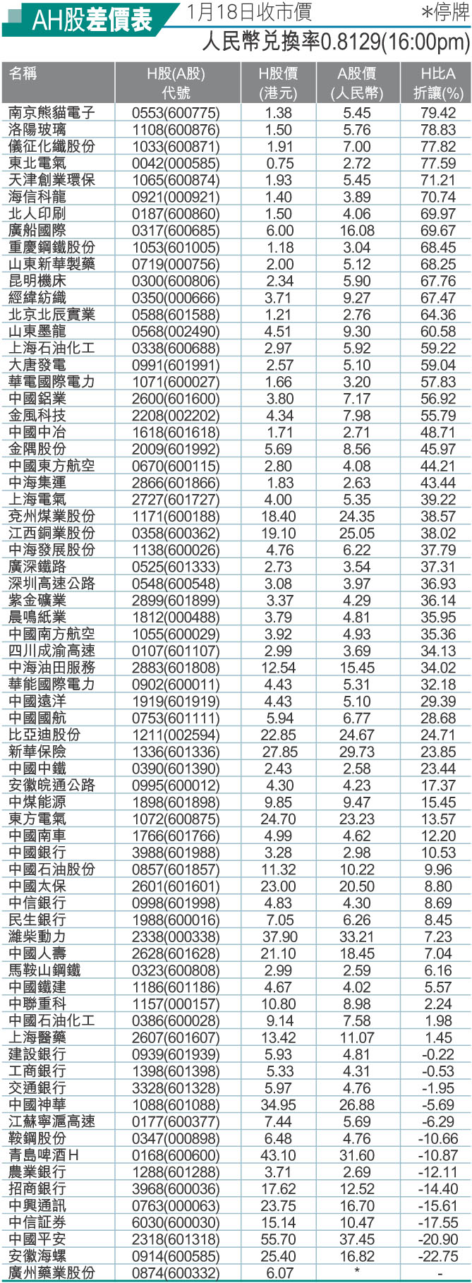 AH股差價表(1月18日收市價)*停牌 (2012-01-19) (圖)